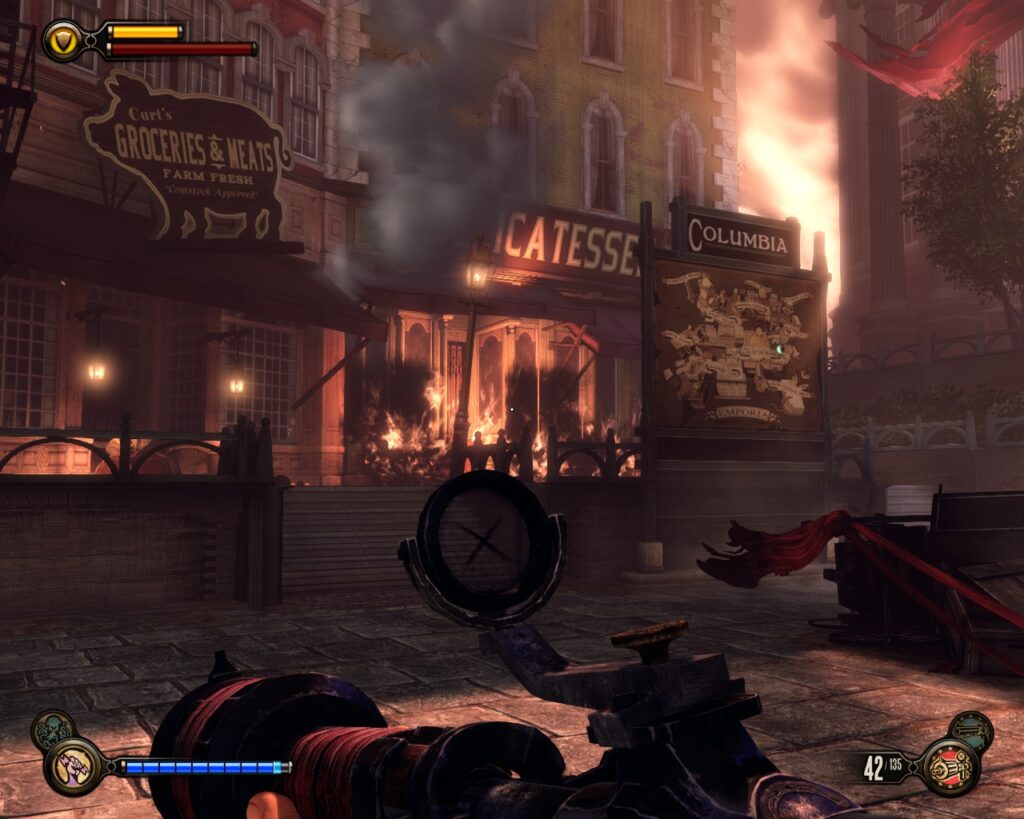 The Emporia is pillaged, burning and it’s clear which side has the upper hand in this conflict. Comstock’s likeness is eradicated with broad strokes of red paint and red flags rags hang all over the place. Elisabeth even remarks that the Vox seem to have agreed on their favourite colour.