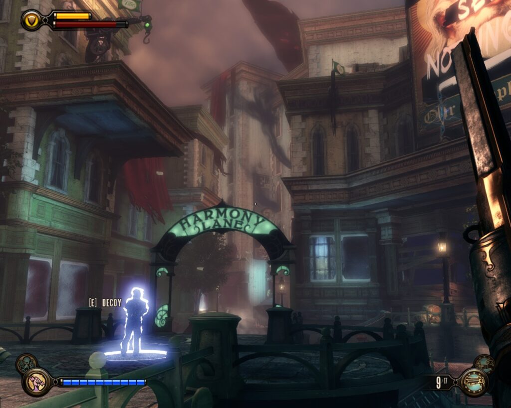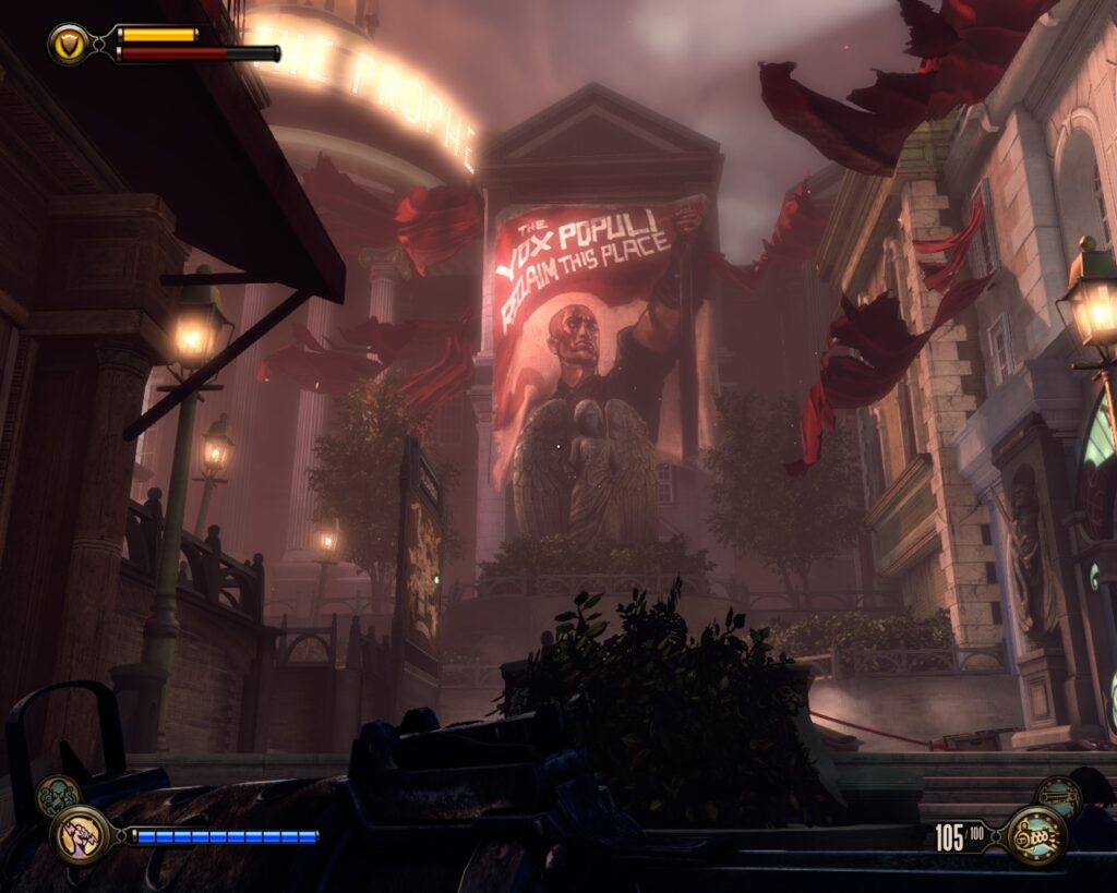 The Victory Square, the area before Comstock House, is empty. “Empty” empty. No one is there. It’s deserted. Not a single man of Columbia’s military or law enforcement, not a single Vox Populi-fighter. This is supposed to be the home of the one man the Vox want dead. The figurehead of Columbia. The man responsible for their suffering. No one.