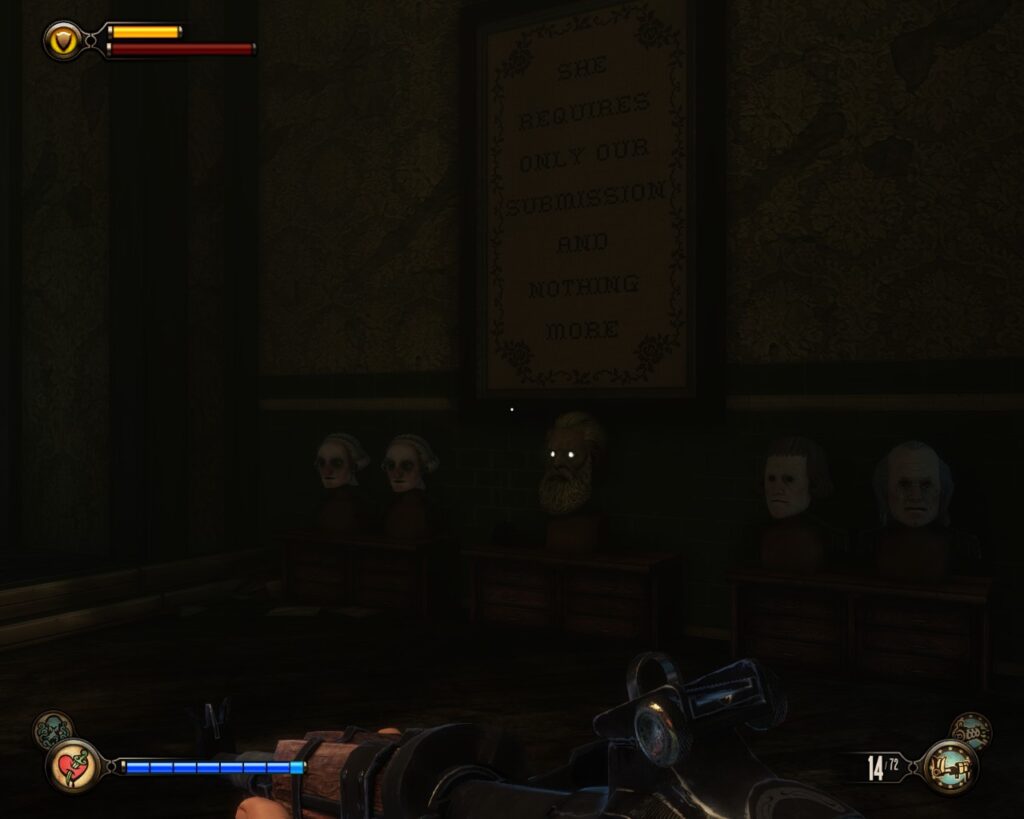 Moving on, we find out the we’re in some kind of asylum. Fallen into disrepair, but still inhabited by the poor souls locked in this hellhole. And all of them wear masks, depicting a founding father. So THAT’s the reason nobody tried to storm this place. Comstock House only holds the name, but is not the actual house of Mr. Comstock but an asylum. It could have been so easy. But no, the lore clearly states that “Comstock established the residence as his principal workplace and central headquarters of the Founders” [source]. So this man added an asylum re-education centre for social dissidents right into his headquarters. Okay. Then why isn’t the bloody Vox all over this place, tearing it apart? Seriously, WHY? This is driving me nuts even more nuts with every new piece of information. But things WILL get worse.