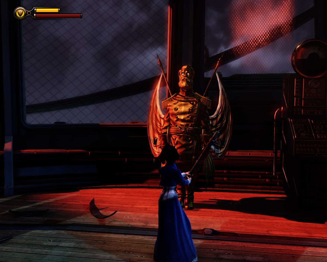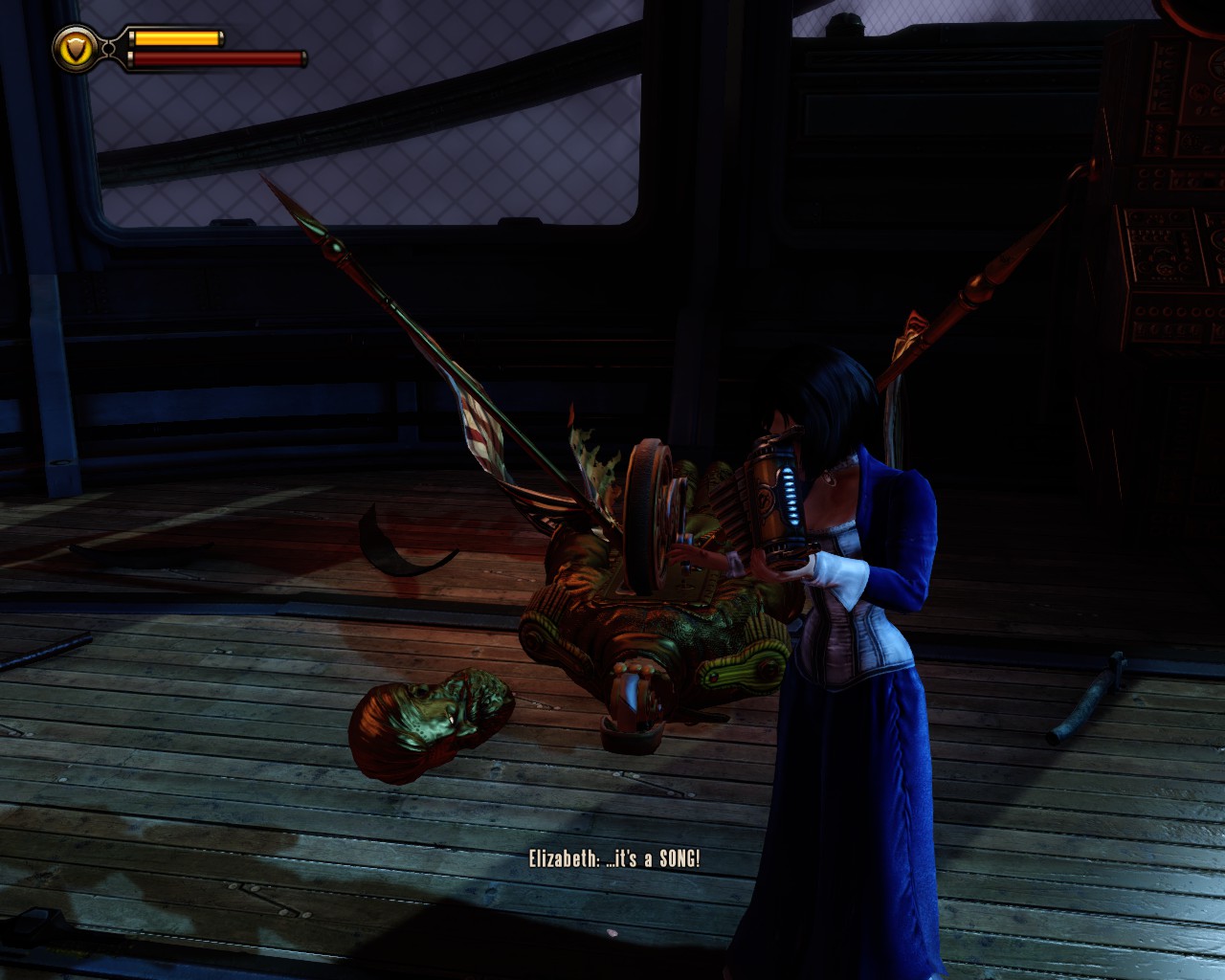 After taking Comstock out of the picture, we move on to the command deck. Here Elisabeth finally gets the meaning of the cage of the note from… the other Elisabeth. The old one. C-A-G-E are the notes necessary to control songbird. She takes apart the nearby control statue to get the whistler out of it. Booker plays the tune, and Songbird is now on out side.