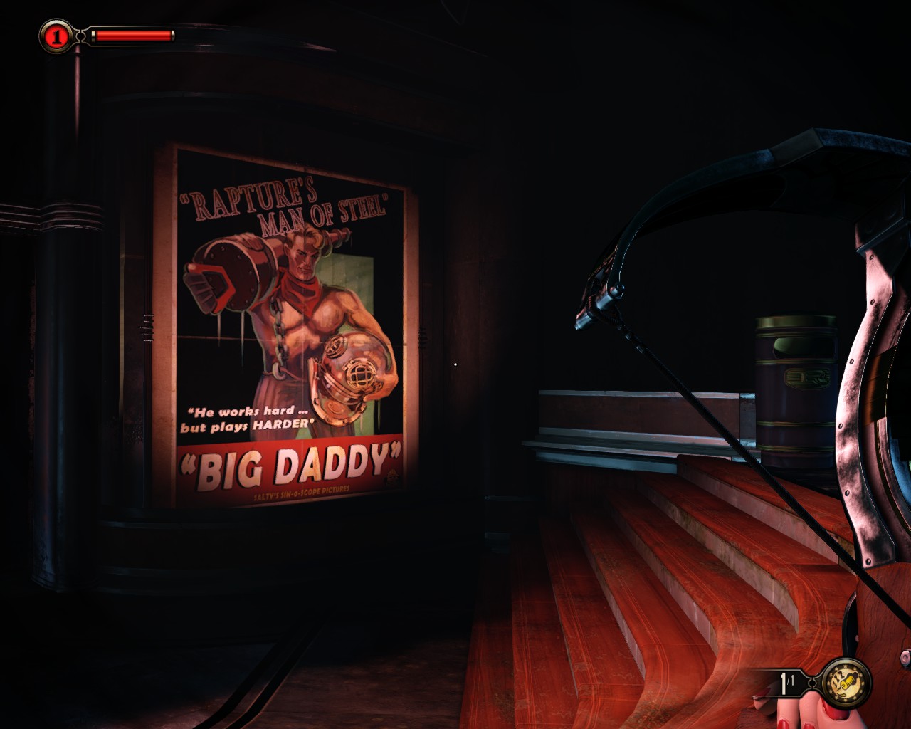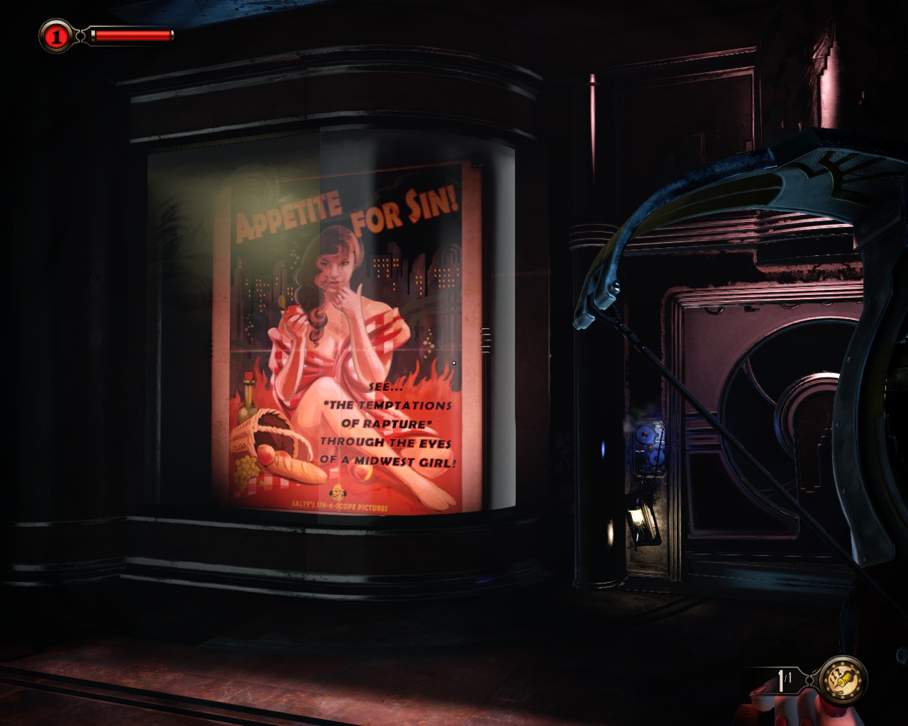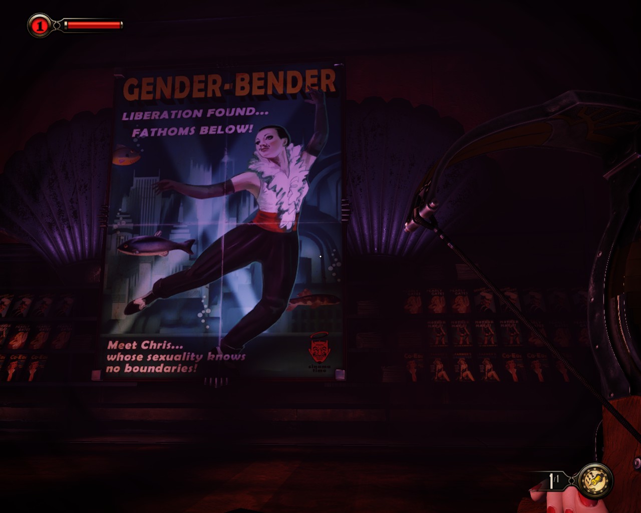 Also in front of the Arrow is another kinetoscope (“Need to Know Theatre”, in Rapture slang): Sex Without Compromise. It basically tells the customer that sex is egotistical, that you and you alone are responsible for your pleasure and the you should set up a written contract before any intercourse, detailing who will do what to whom. Note: written contract. Oh, the pleasures of the free market…